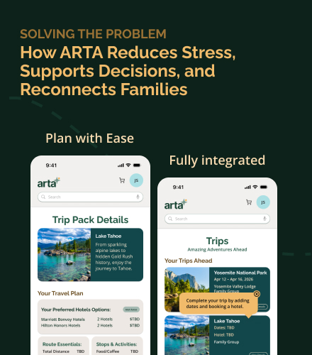 Drawing on my background in UX, systems design, and emerging technologies, I created ARTA—an AI- and AR-powered travel assistant designed to reduce planning friction, improve discovery, and transform road trips into shared, engaging experiences across mobile devices, car displays, and AR interfaces.