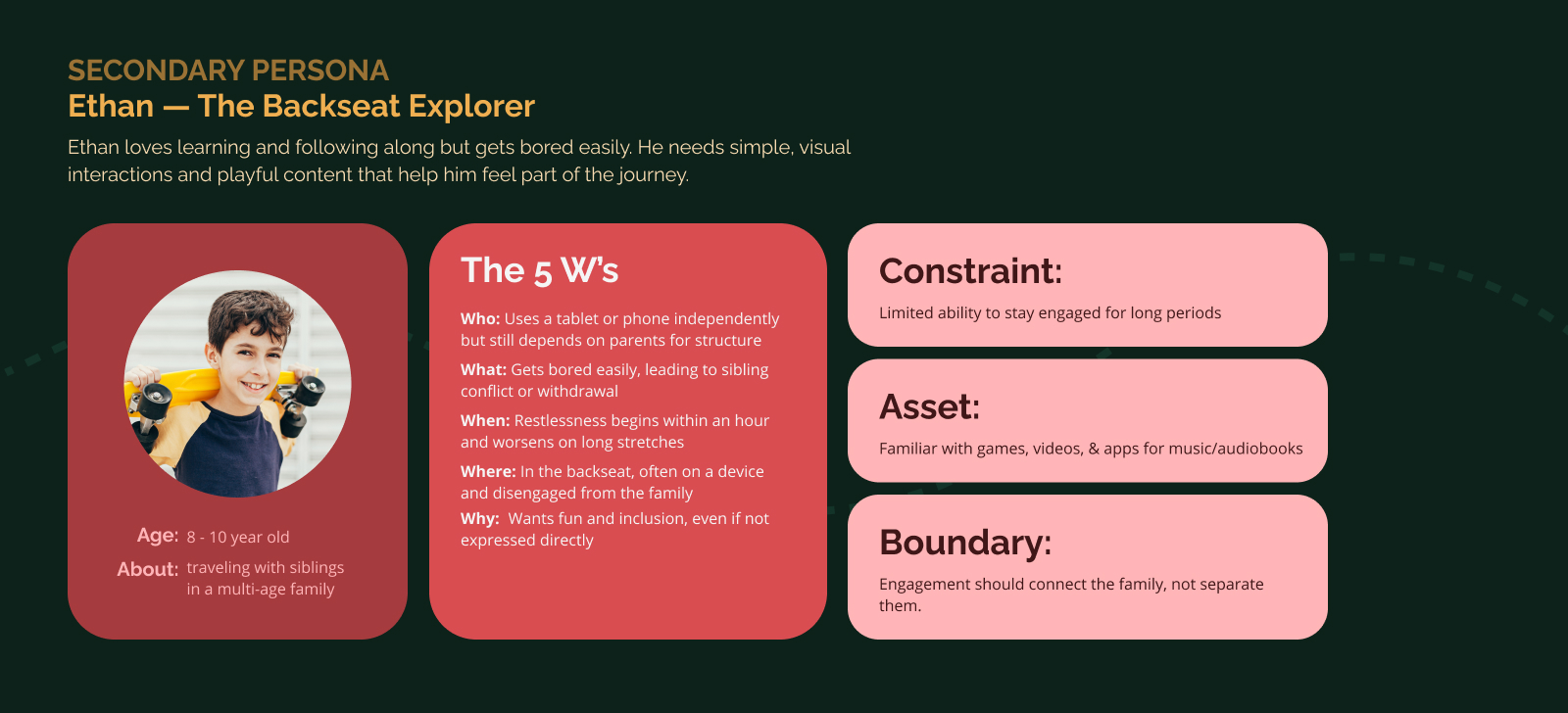 - Conducted interviews with parents and families focused on road-trip behavior, pain points, and engagement patterns